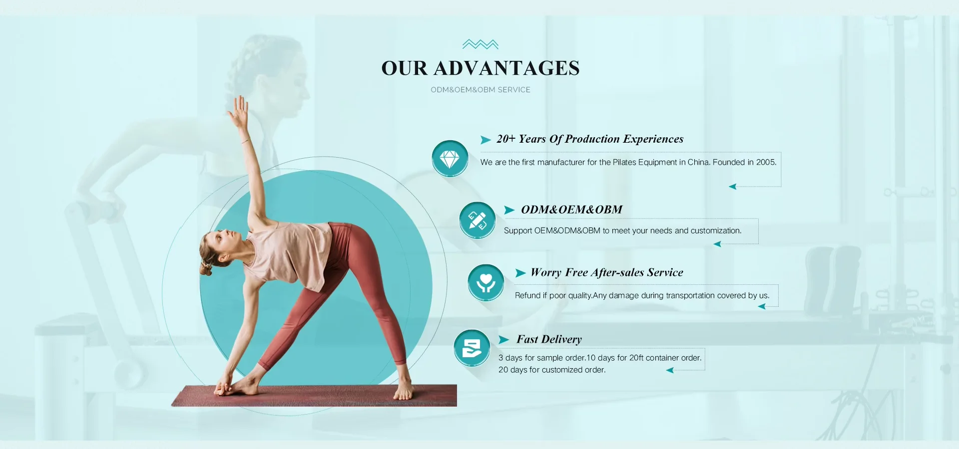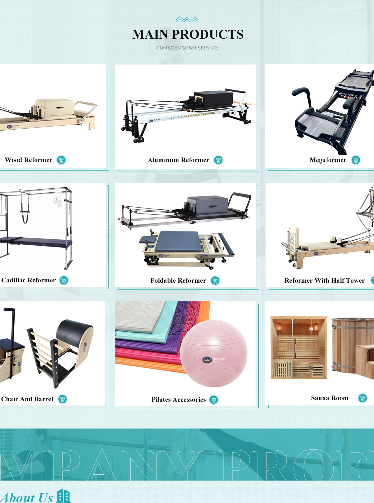 主な製品:ピラティスリフォーマー、キャデラックリフォーマー、ラダーバレル、コンボチェア、メガフォーマー